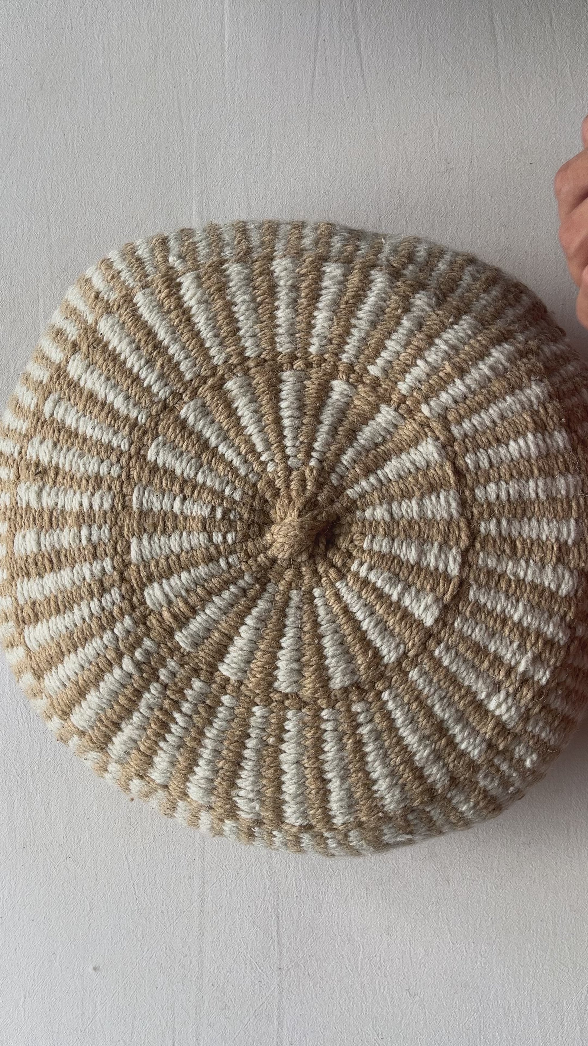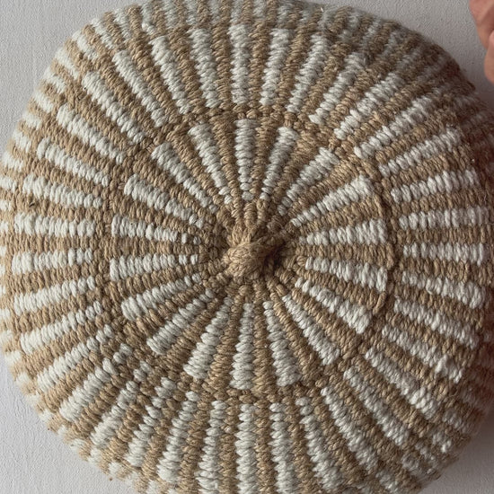 Two-tone round cushion featuring a Comb design, handwoven with pure sheep wool by artisans in northern Argentina.