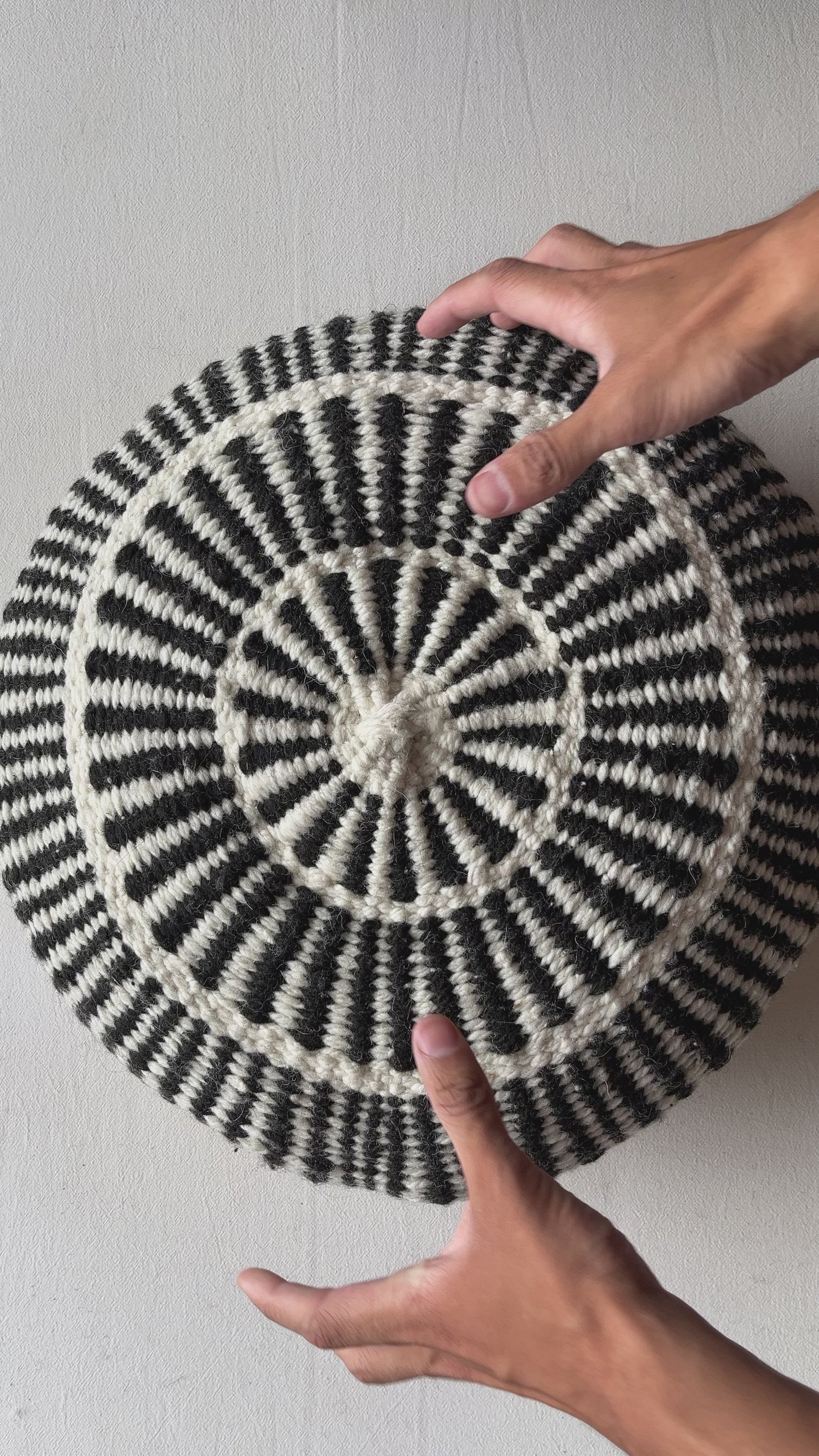 Two-tone round cushion featuring a Comb design, handwoven with pure sheep wool by artisans in northern Argentina.