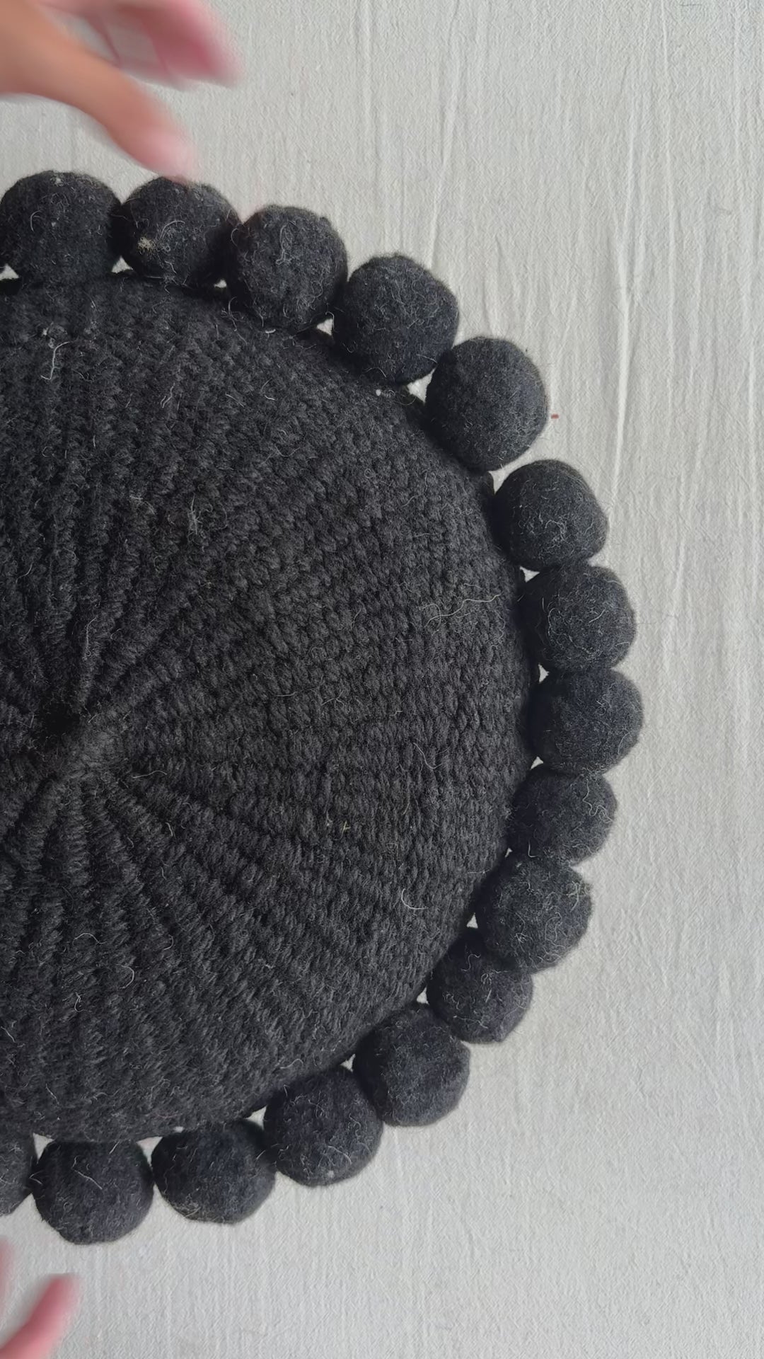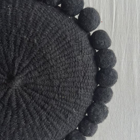 Handwoven round cushion made from pure sheep wool, with handmade pom poms around the edges. Crafted by artisans in northern Argentina.