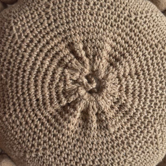 Handwoven round cushion made from pure sheep wool, with handmade pom poms around the edges. Crafted by artisans in northern Argentina.