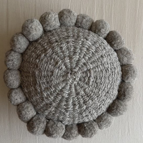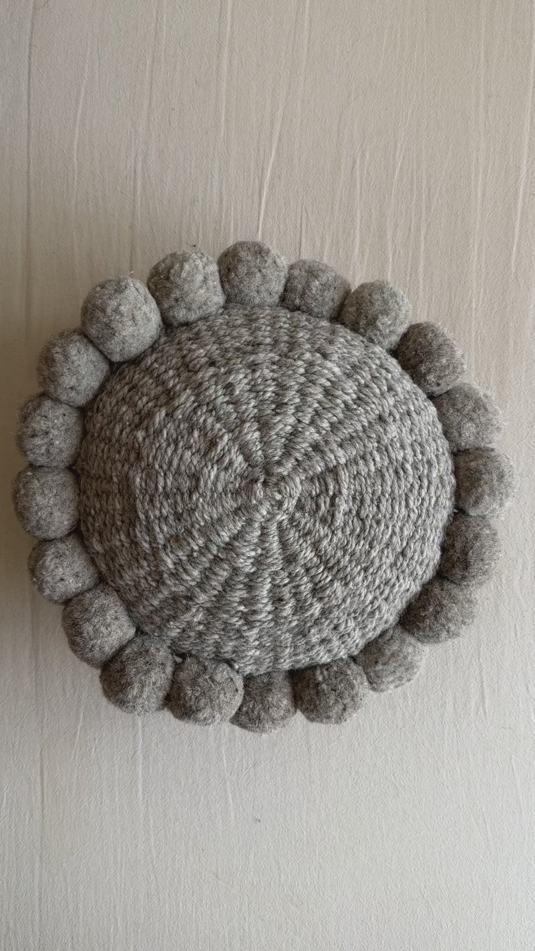 Handwoven round cushion made from pure sheep wool, with handmade pom poms around the edges. Crafted by artisans in northern Argentina.