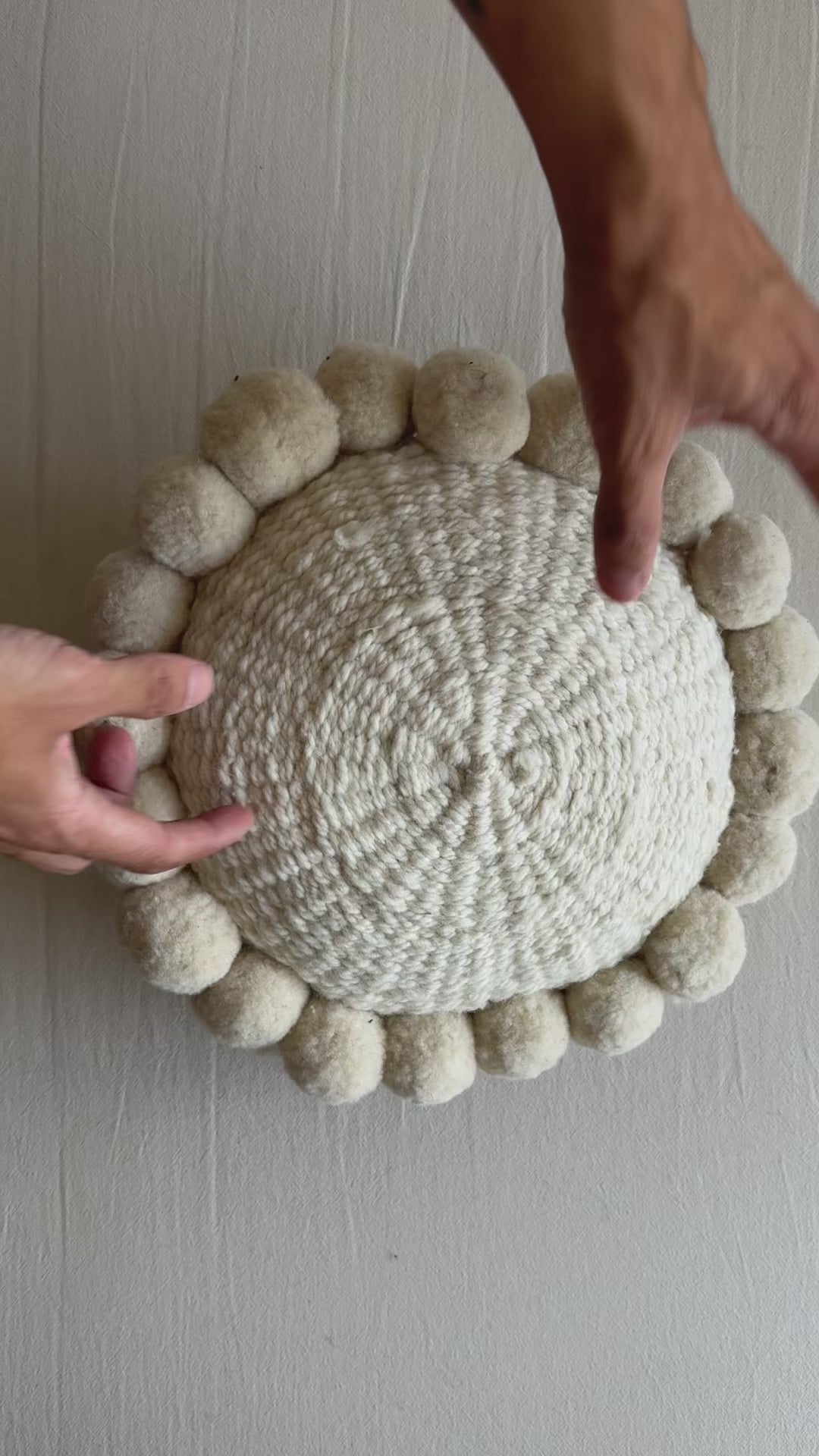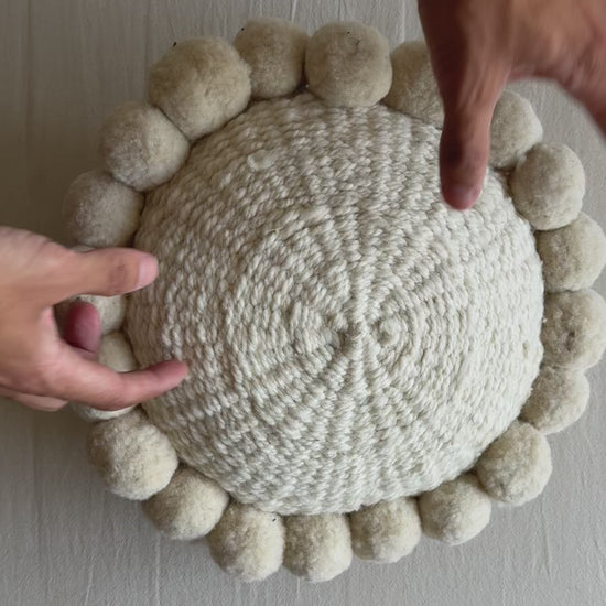 Handwoven round cushion made from pure sheep wool, with handmade pom poms around the edges. Crafted by artisans in northern Argentina.
