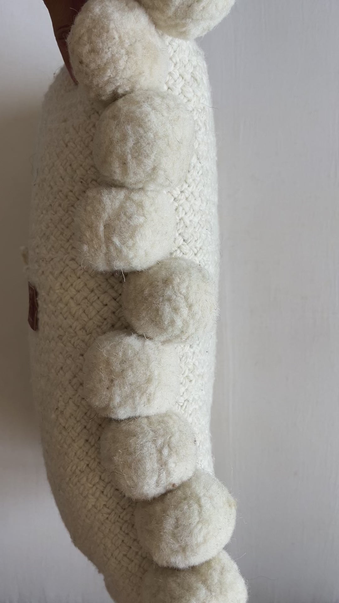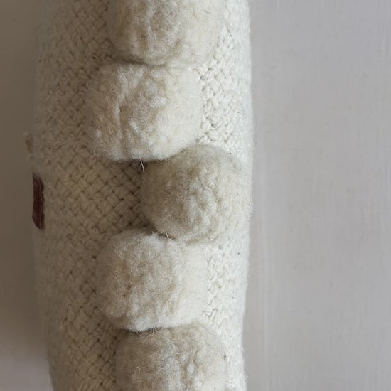 Handwoven square cushion made from pure sheep wool, with handmade pom poms around the edges. Crafted by artisans in northern Argentina.
